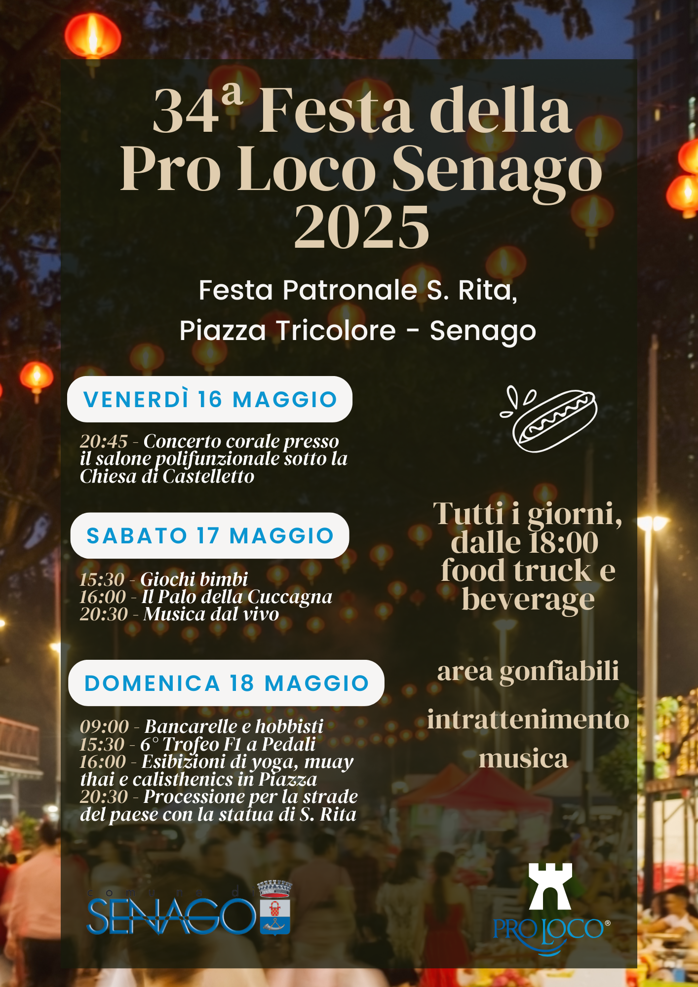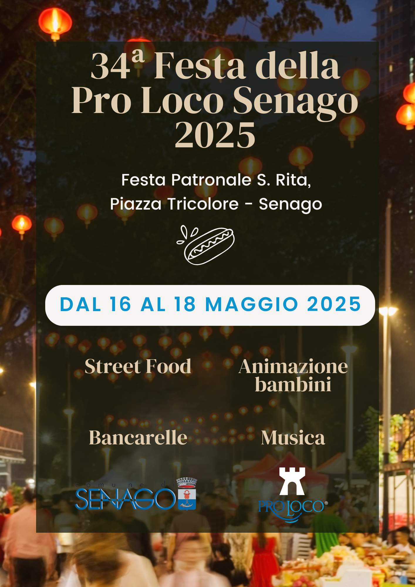 PRO LOCO SENAGO con il patrocino del COMUNE DI SENAGO, presentano la 34esima edizione della Festa Pro Loco Senago, in Piazza Tricolore dal 16 al 18 maggio 2025