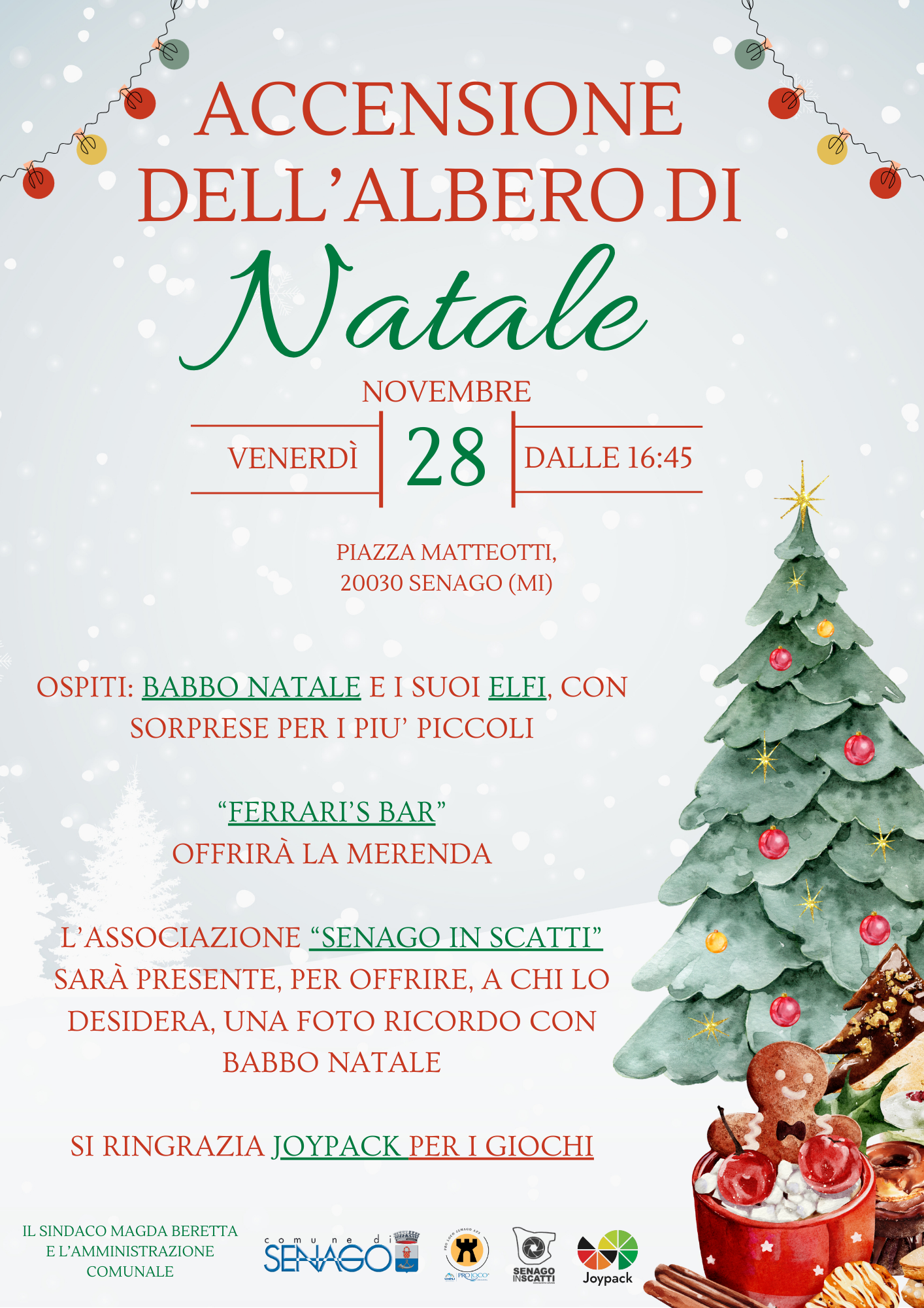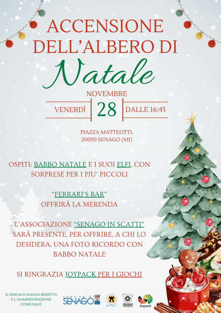 Il Natale a Senago prenderà ufficialmente il via Venerdì 28 novembre 2025 con la tradizionale accensione delle luminarie e del grande albero di Natale in Piazza Matteotti.