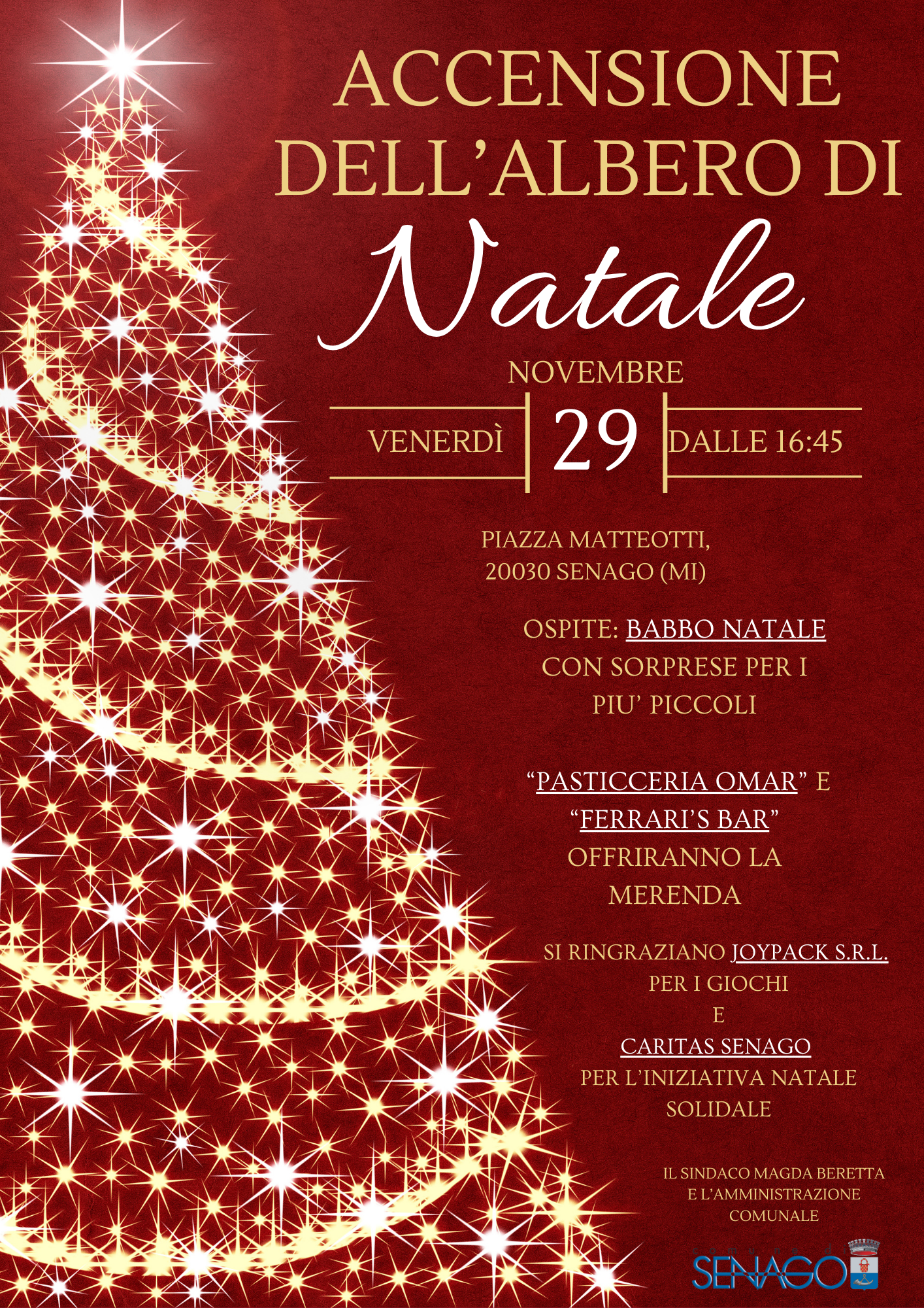 Il Comune di Senago rende noto a tutta la Cittadinanza che venerdì 29 novembre 2024 dalle ore 16:45 presso la Piazza Matteotti, ci sarà la cerimonia di accensione dell’Albero di Natale.
