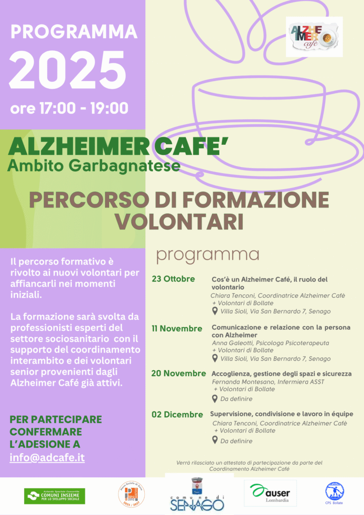 La formazione sarà svolta da professionisti esperti del settore sociosanitario con il supporto del coordinamento interambito e dei volontari senior provenienti dagli Alzheimer Cafè già attivi.