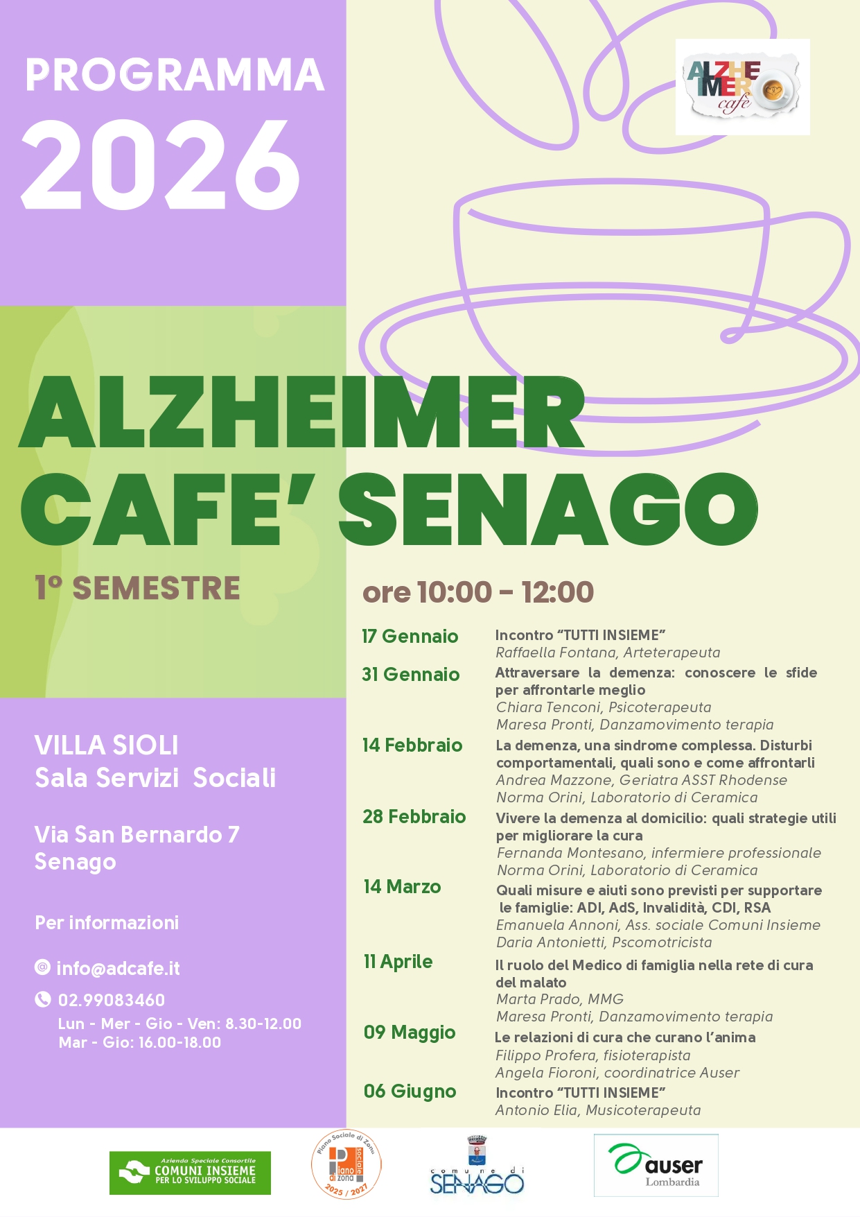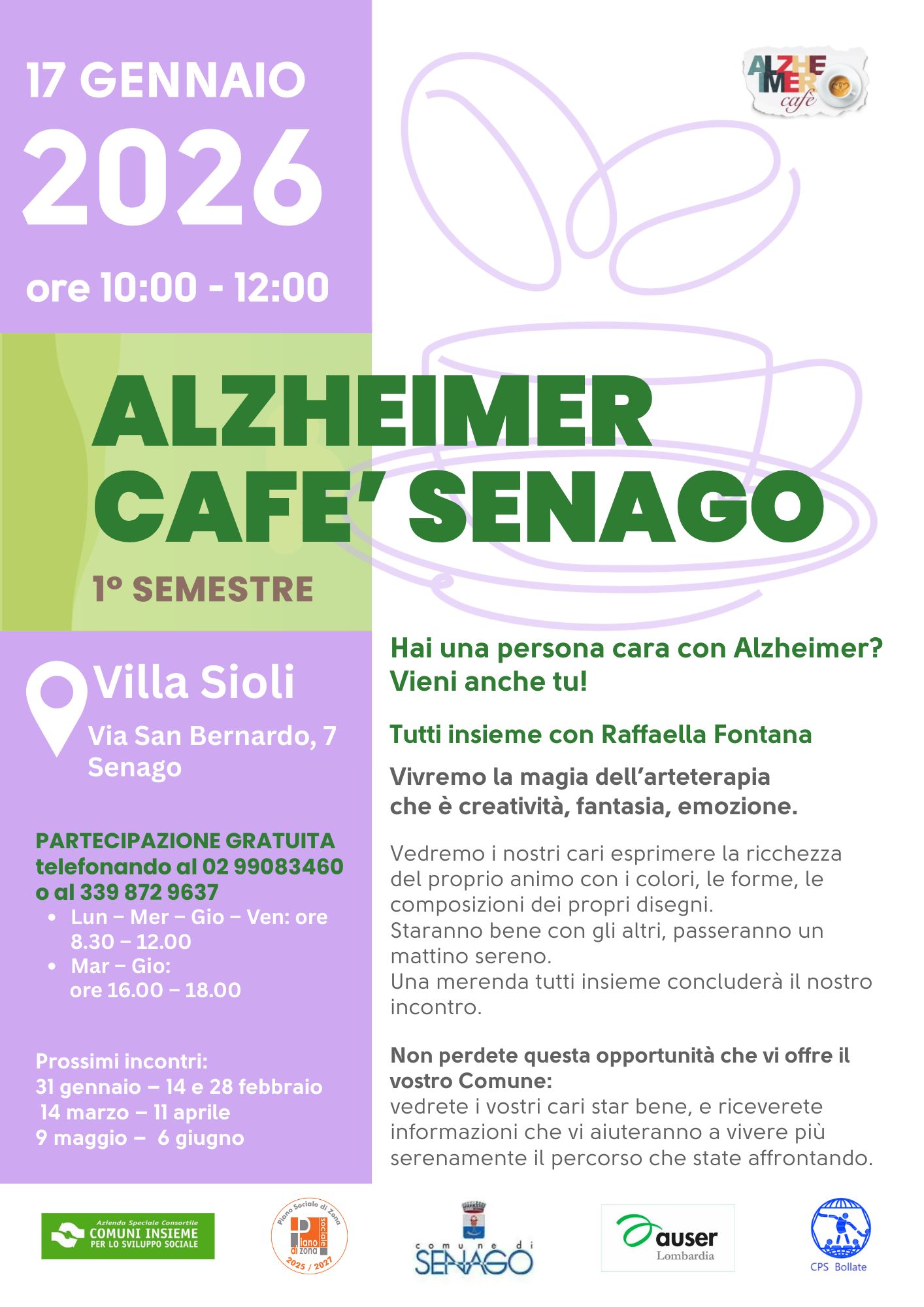 Il giorno di sabato 17 gennaio 2026, inizierà l’Alzheimer Cafè con il primo incontro, dalle ore 10 alle 12 presso la Villa Sioli in via S. Bernardo 7 a Senago.
