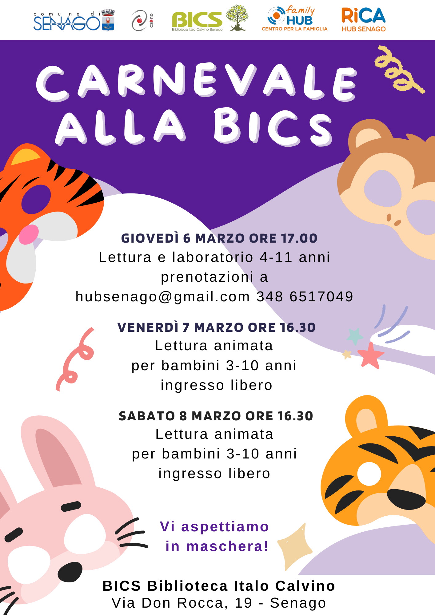 Festa, maschere, letture e laboratori…π π π ‘π π π ₯π π π alla BICS Γ¨ tutto questo! Preparatevi a vivere tre pomeriggi all’insegna del colore e del divertimento: π π’π¨π―πππ’Μ π π¦ππ«π³π¨ π¨π«π ππ:ππ lettura e laboratorio a cura diΒ RICA – HUB SenagoΒ (4-11 anni). Prenotazioni a hubsenago@gmail.com – 348 6517049 π―ππ§ππ«ππ’Μ π π π¬πππππ¨ π π¦ππ«π³π¨ π¨π«π ππ:ππ letture animate a cura delle bibliotecarie (3-10 anni) – ingresso libero Noi pensiamo alla festa e voi alla maschera!Vi aspettiamoΒ