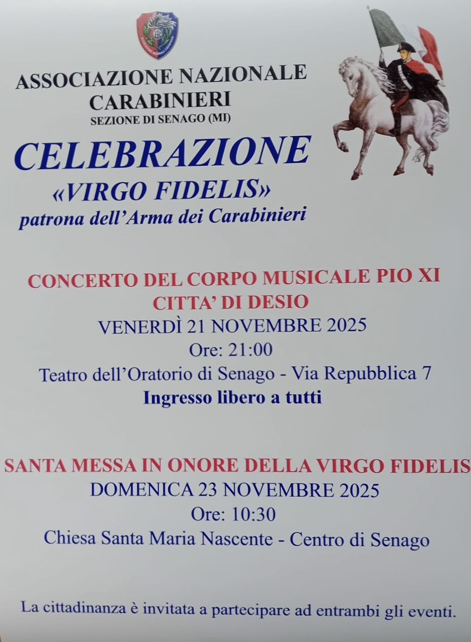 - Concerto del Corpo Musicale “Pio XI – Città di Desio”, venerdì 21 novembre 2025 ore 21:00, presso il Teatro dell’Oratorio di Senago in via Repubblica, 7 – Senago (MI) 20030;