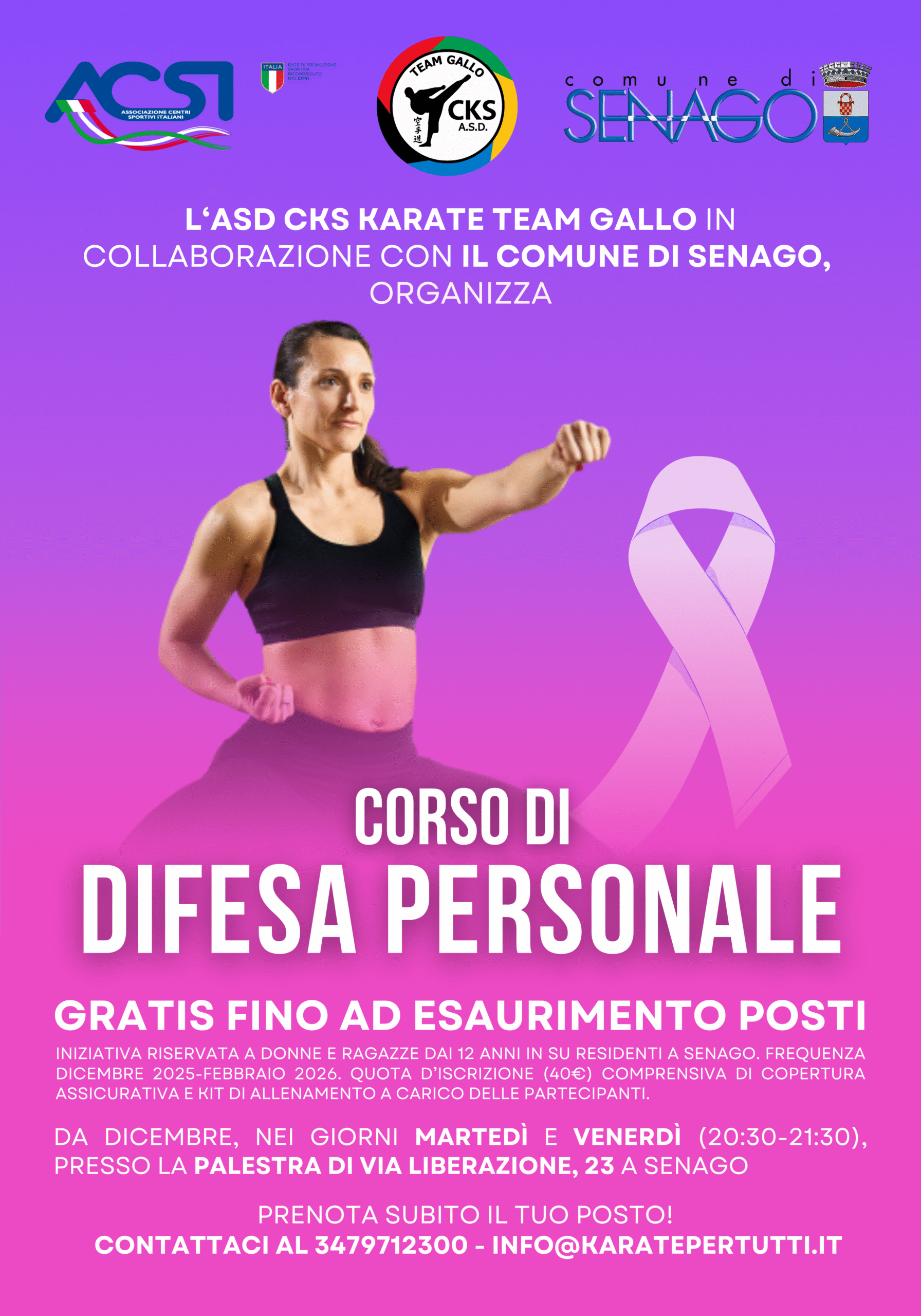 L’ASD CKS Team Gallo in collaborazione con il Comune di Senago organizza un CORSO DI DIFESA PERSONALE, gratis fino ad esaurimento posti.