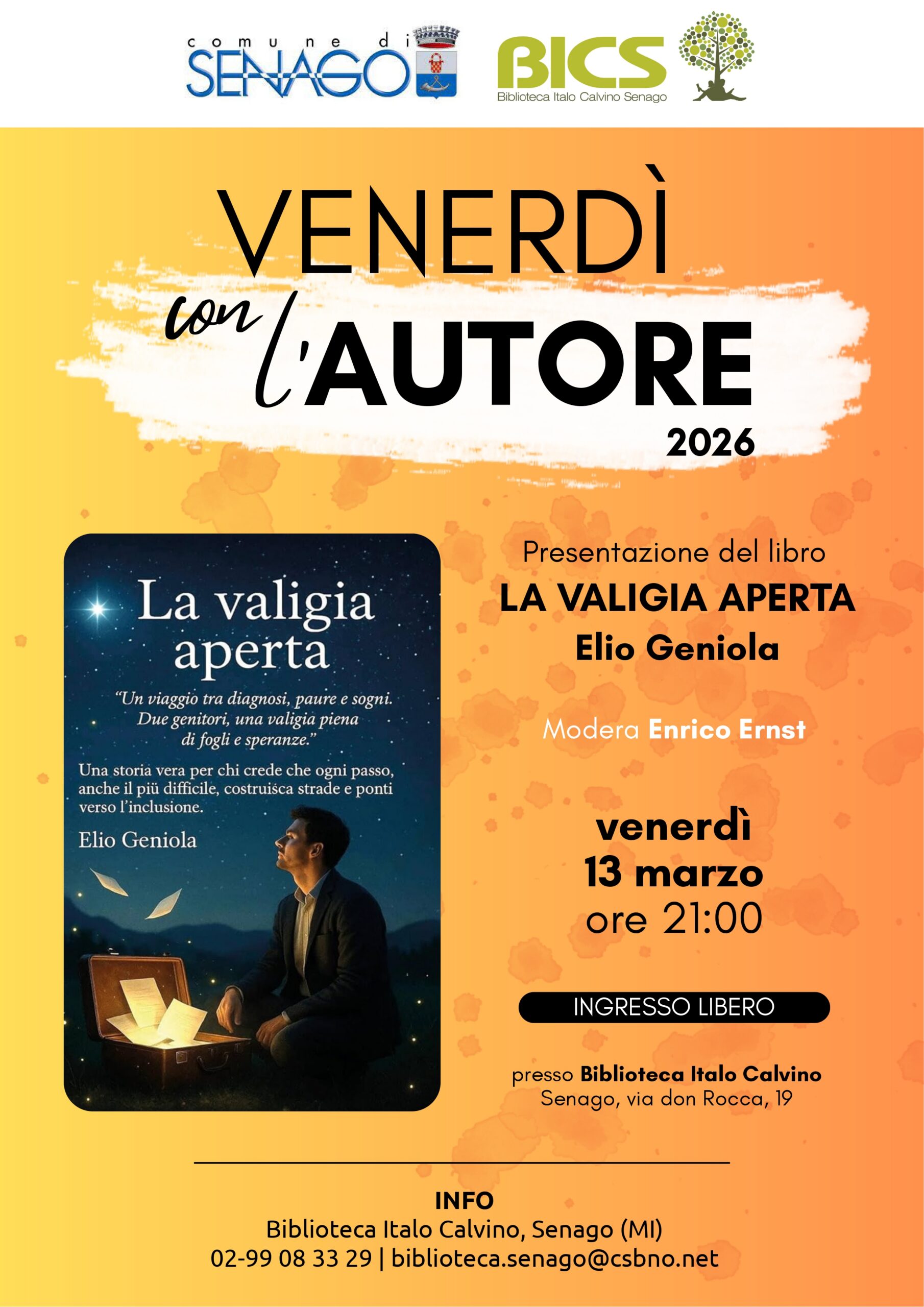 La BICS – Biblioteca Italo Calvino Senago, con il patrocinio del Comune di Senago, organizza “Venerdì con l’autore“, una rassegna di cinque incontri con gli autori del territorio per presentare i loro libri, con interventi e dibattiti, per trascorrere una serata insieme.