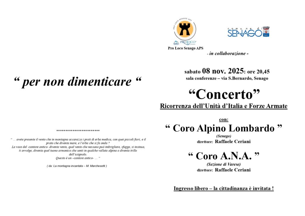 Sabato 8 Novembre 2025, dalle ore 20:45, presso la Sala Conferenze di Villa Sioli, in via S. Bernardo 7, Senago, si svolgerà un concerto dal titolo “Per non dimenticare“. Organizzato da Pro Loco Senago con il patrocinio del Comune di Senago. Con il Coro Alpino Lombardo di Senago e il Coro A.N.A. di Varese. Ingresso libero.