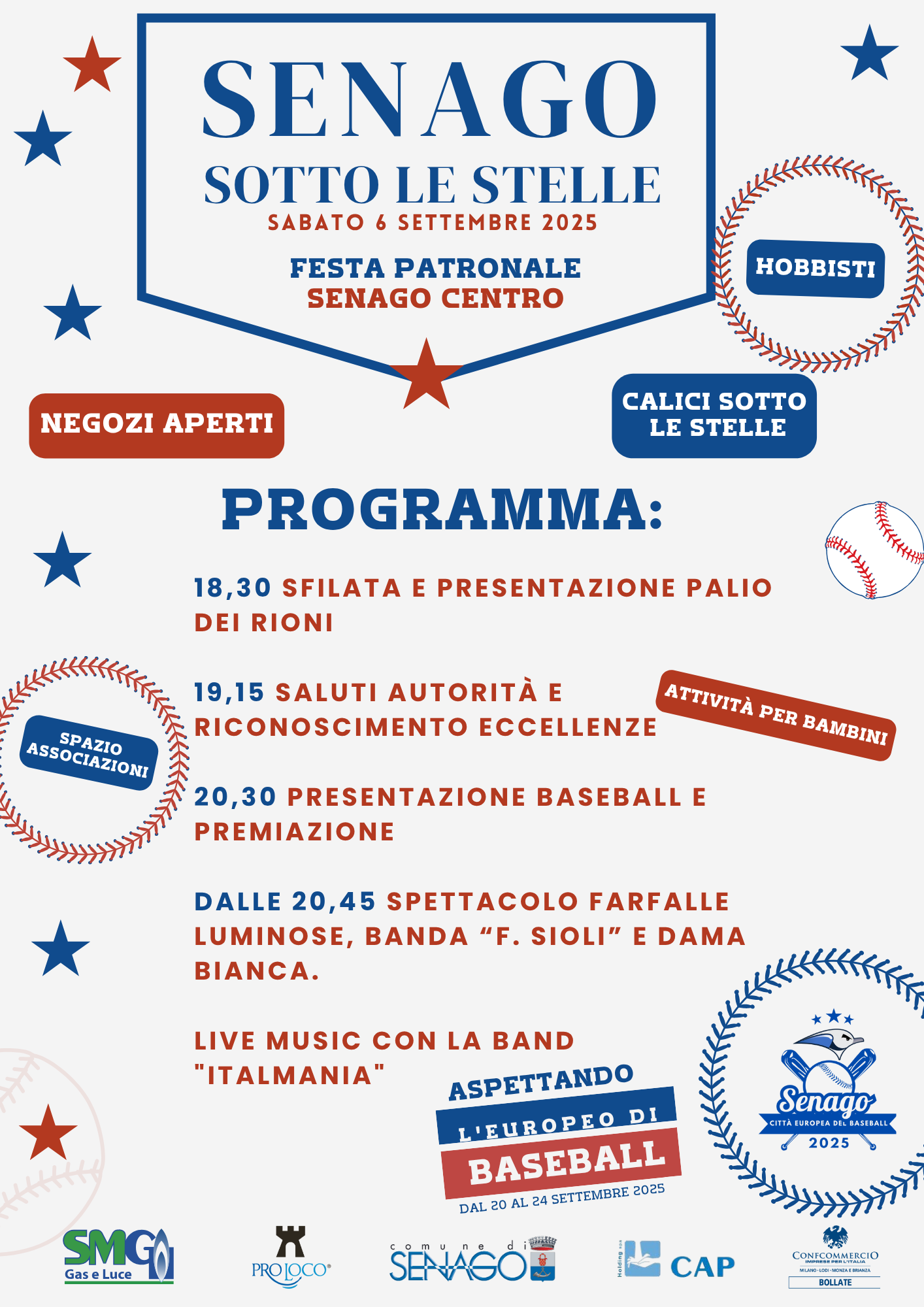 L’Amministrazione Comunale, in collaborazione con Pro Loco Senago, SMG Gas e Luce, Gruppo CAP e Confcommercio, è lieta di presentare la Festa Patronale 2025: Calici sotto le stelle: