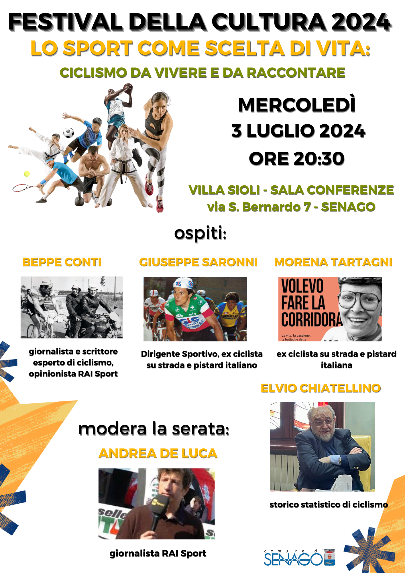 Il Comune di Senago presenta la seconda edizione del Festival della Cultura, quest’anno dedicato alla cultura dello sport, intitolato: “Lo sport come scelta di vita”, che si terrà nei giorni 28 Giugno, 3 e 11 Luglio 2024, nella Sala Conferenze di Villa Sioli, via S. Bernardo 7 a Senago.