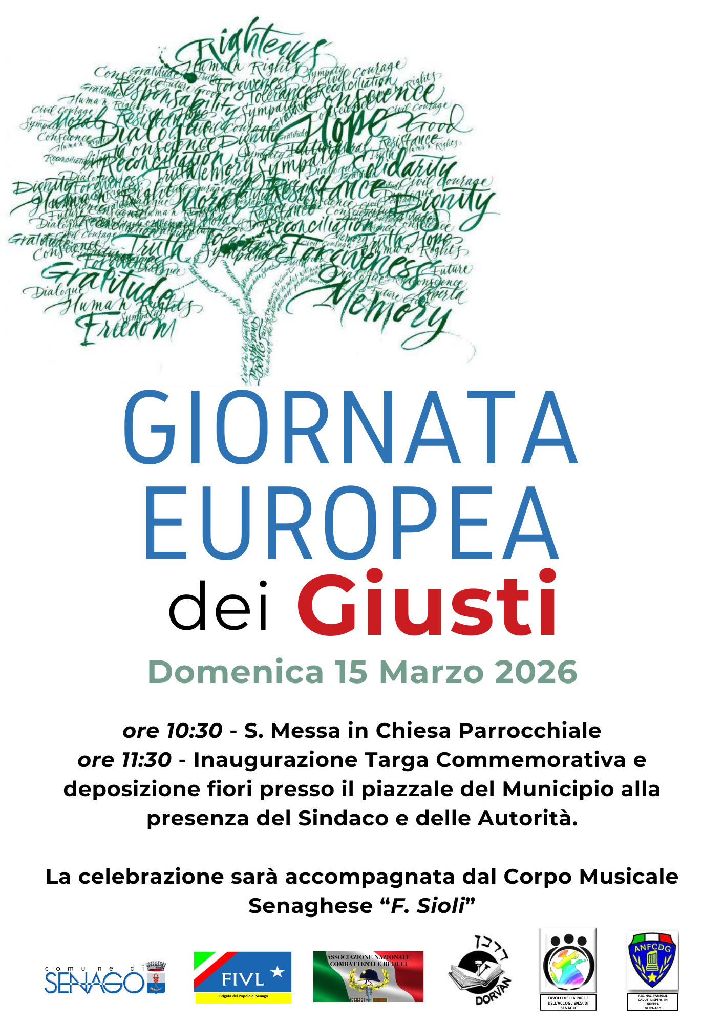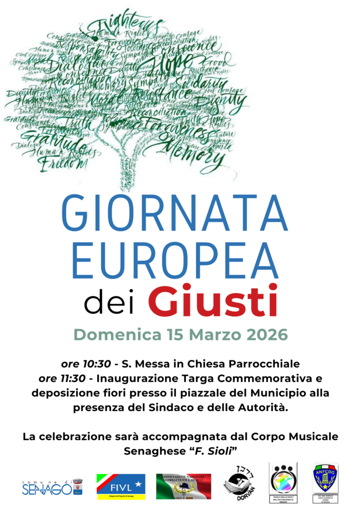 Domenica 15 marzo 2026 a Senago si celebra la Giornata Europea dei Giusti, ricorrenza dedicata alla memoria di coloro che, in ogni tempo e in ogni luogo, si sono distinti per aver difeso la dignità umana e i diritti fondamentali, opponendosi alle persecuzioni e alle ingiustizie.