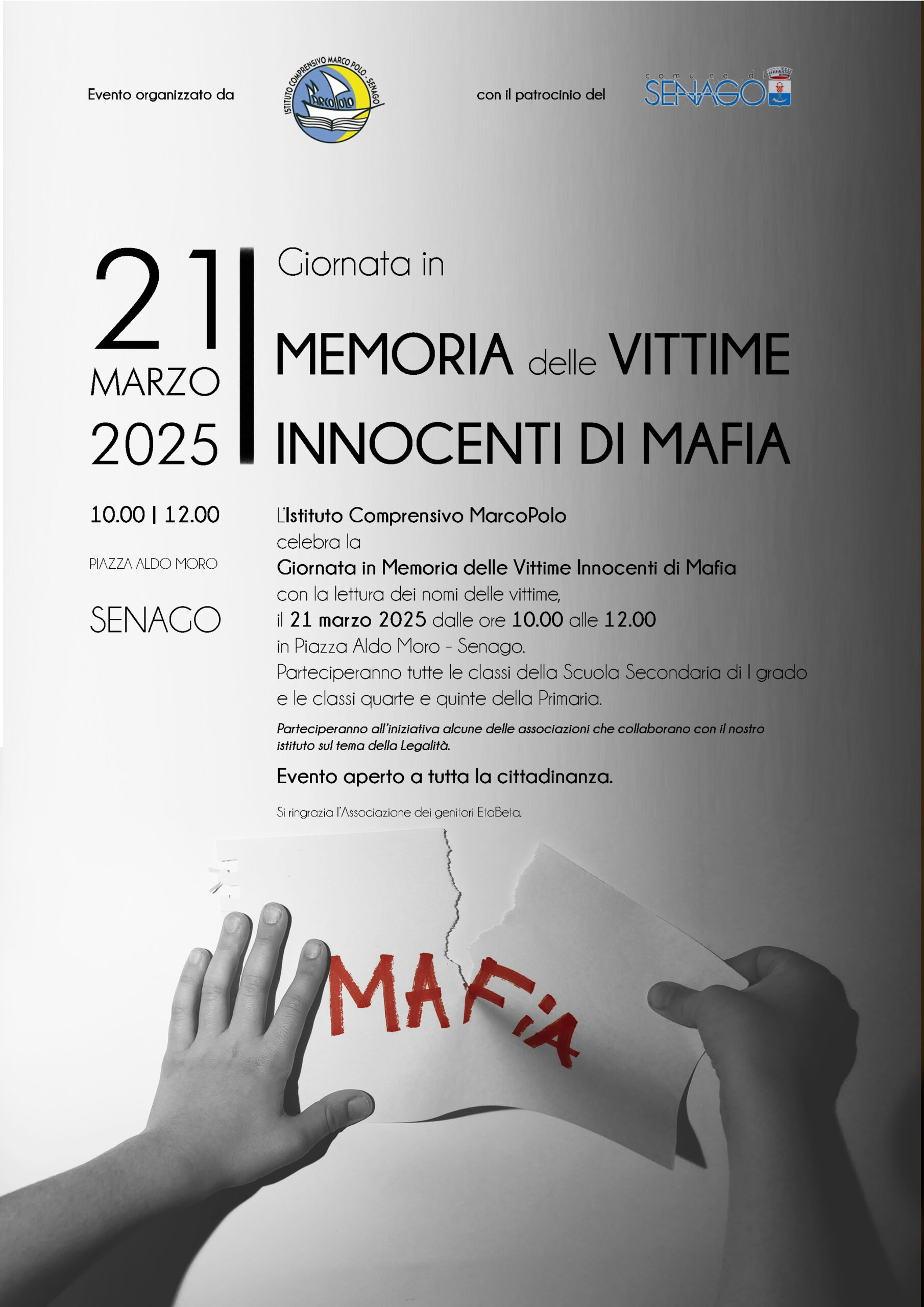 Il giorno venerdì 21 marzo 2025, dalle ore 10:00 alle 12:00, in Piazza Aldo Moro, l’Istituto Comprensivo Marco Polo, con il patrocinio del Comune di Senago, celebrerà la Giornata in Memoria delle Vittime Innocenti di Mafia, con la lettura dei nomi delle vittime.