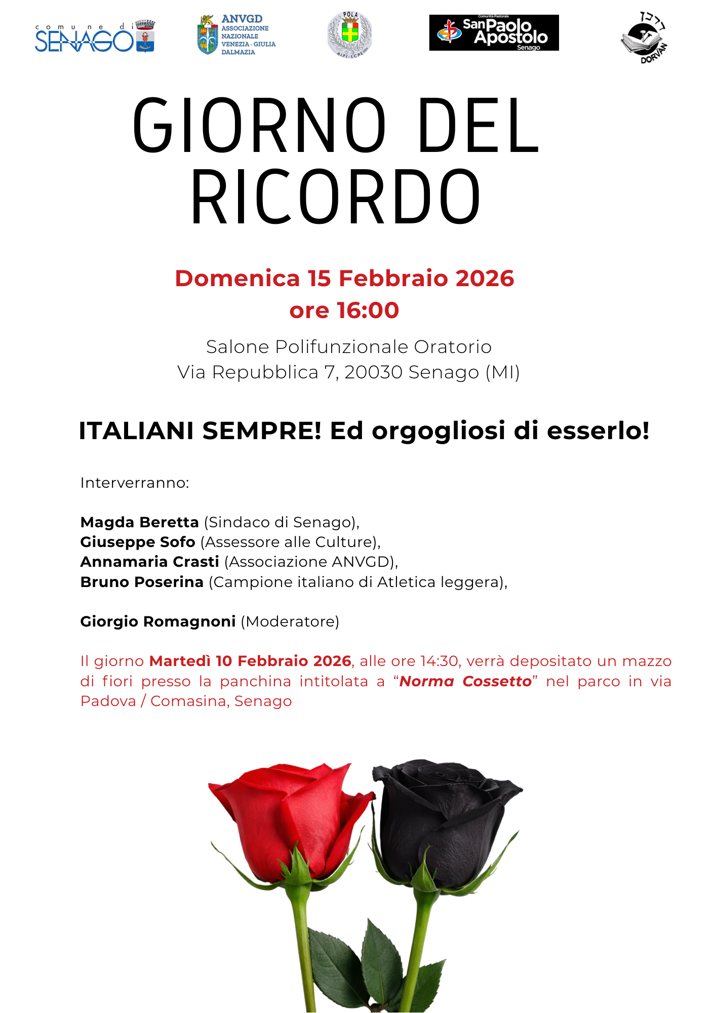 Si rende noto alla Cittadinanza, l’evento del Comune di Senago per commemorare il Giorno del Ricordo.