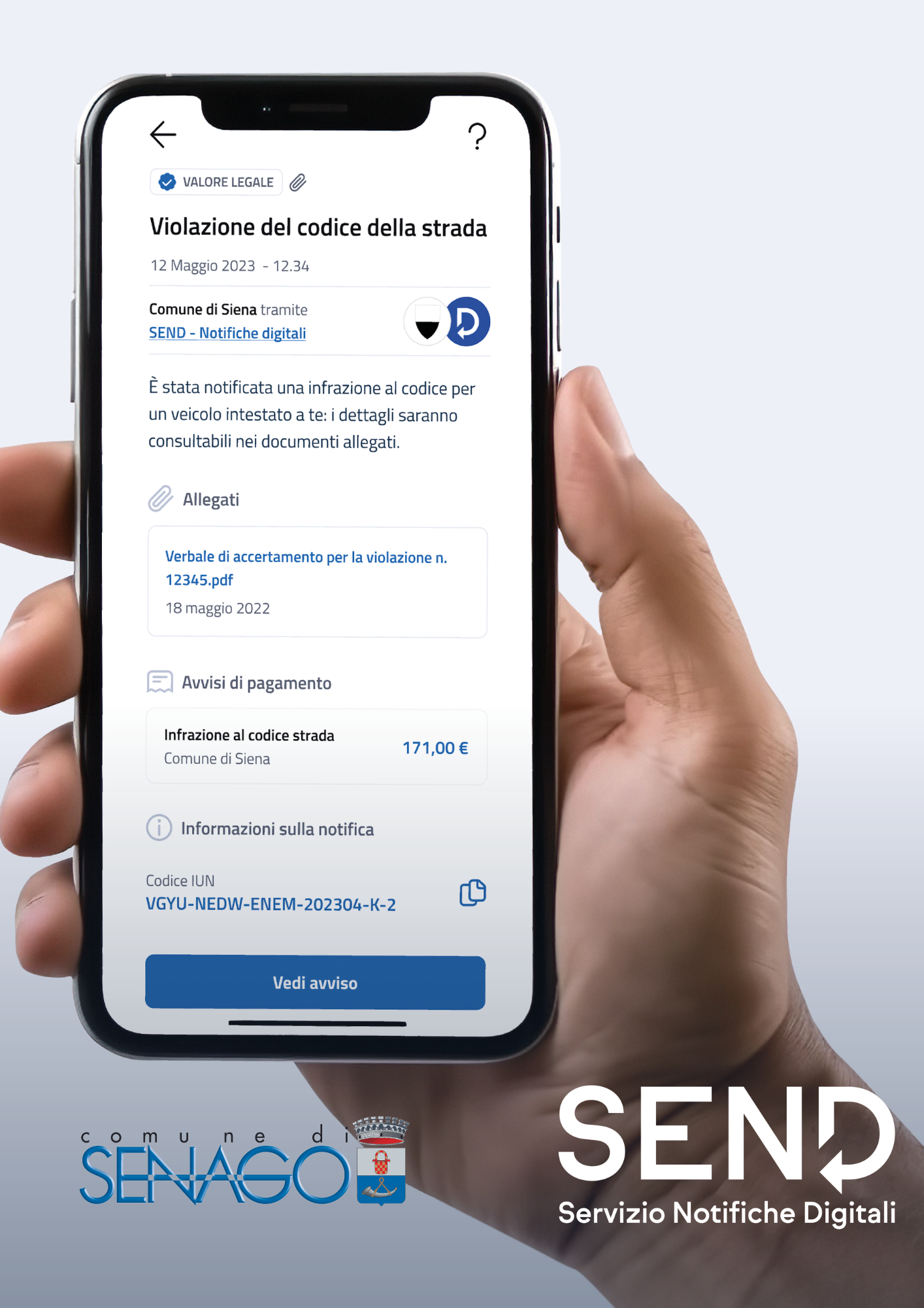 Grazie alle risorse del PNRR il Comune di Senago ha aderito a SEND, la nuova infrastruttura digitale realizzata da PagoPA S.p.A. insieme al Dipartimento per la trasformazione digitale della Presidenza del Consiglio dei Ministri, che offre alle Pubbliche Amministrazioni un sistema standard per rendere più semplice, efficiente, sicura ed economica la notificazione con valore legale di atti amministrativi.