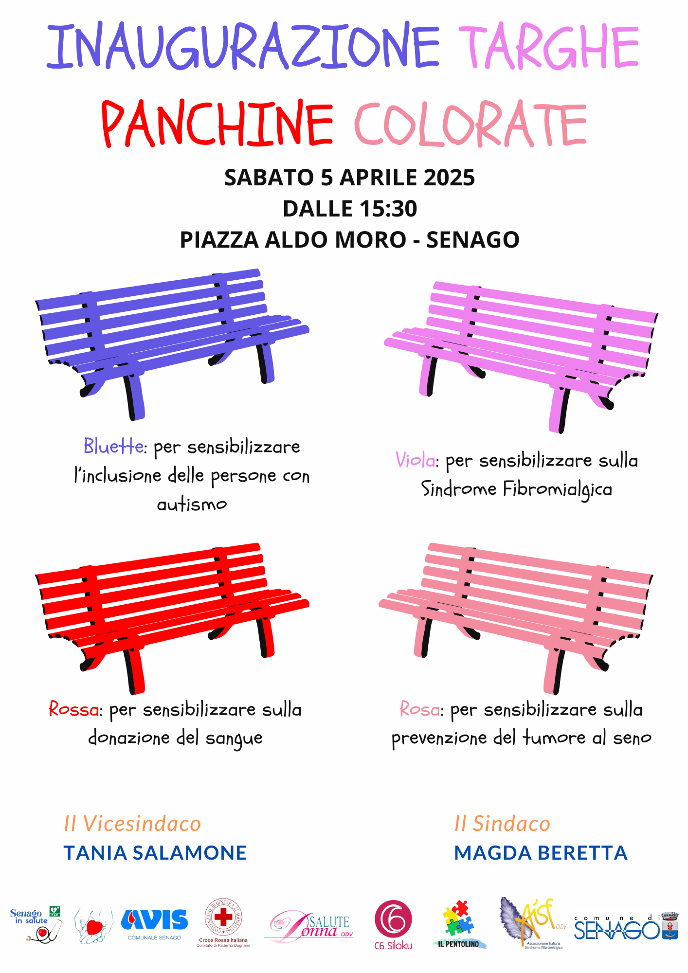 sabato 5 aprile 2025 dalle ore 15:30 in Piazza Aldo Moro – Piazza del Mercato, verranno inaugurate le targhe tematiche sulle panchine colorate.