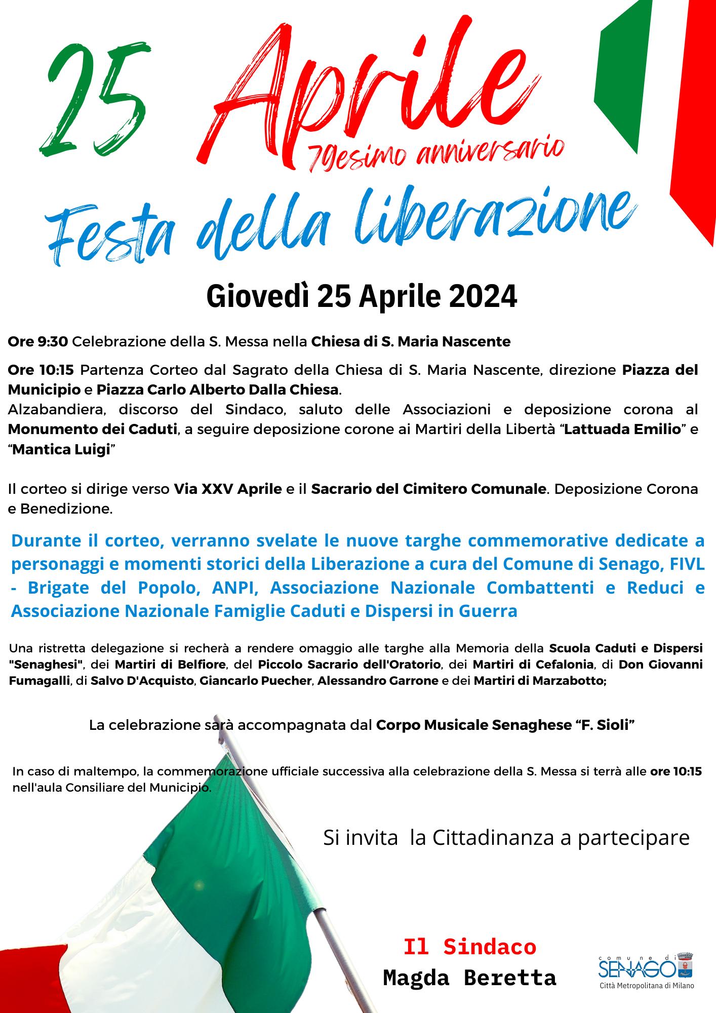 Una ristretta delegazione si recherà a rendere omaggio alle targhe alla Memoria della Scuola Caduti e Dispersi “Senaghesi”, dei Martiri di Belfiore, del Piccolo Sacrario dell’Oratorio, dei Martiri di Cefalonia, di Don Giovanni Fumagalli, di Salvo D’Acquisto, Giancarlo Puecher, Alessandro Garrone e dei Martiri di Marzabotto;
