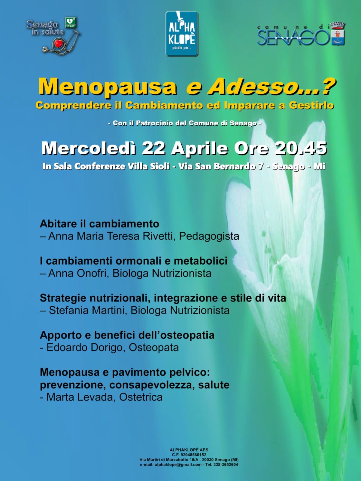 Il Comune di Senago, promuove una serata informativa di Alphaklopè APS, attraverso l’iniziativa “Senago in Salute“, dedicata al tema della menopausa, momento importante nella vita di ogni donna, che richiede consapevolezza e strumenti adeguati per essere affrontato in modo sereno.