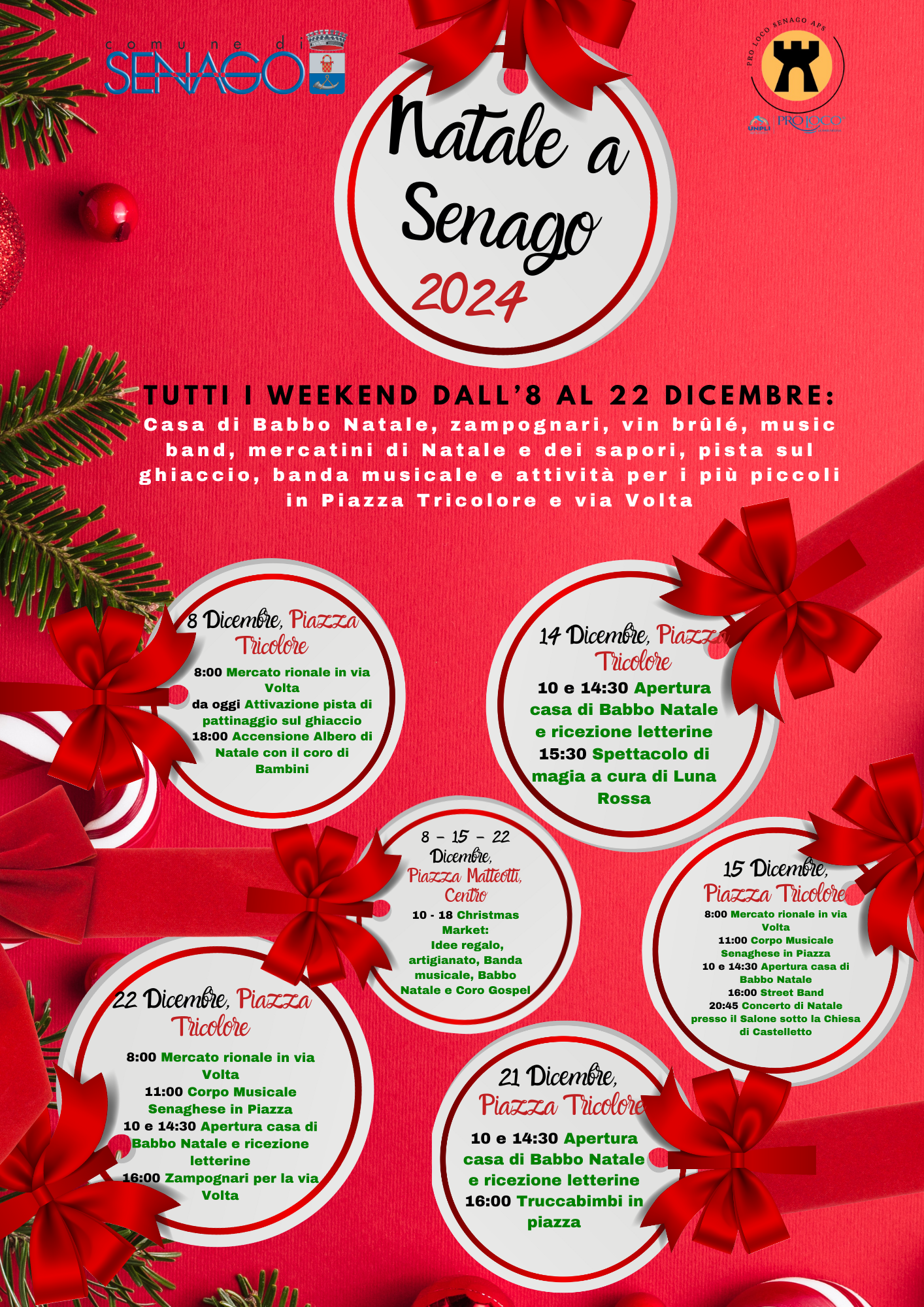 NATALE A SENAGO 2024 Il Comune di Senago con la partecipazione dell’associazione Pro Loco Senago, la collaborazione di volontari e commercianti, è lieto di presentare le iniziative Natalizie in programma per il paese, per tutto il mese di dicembre