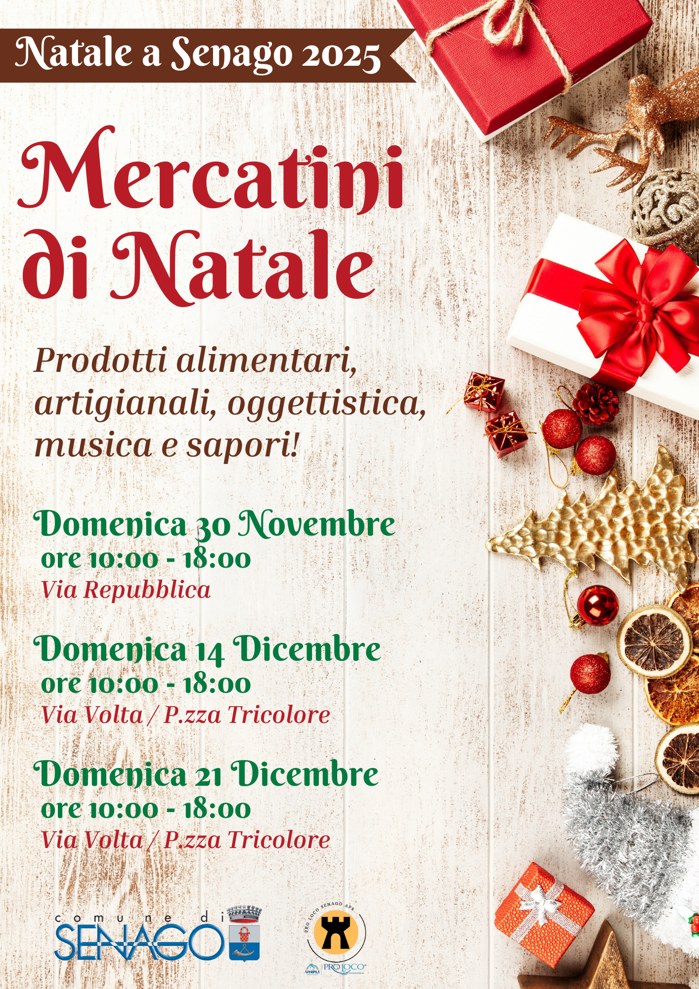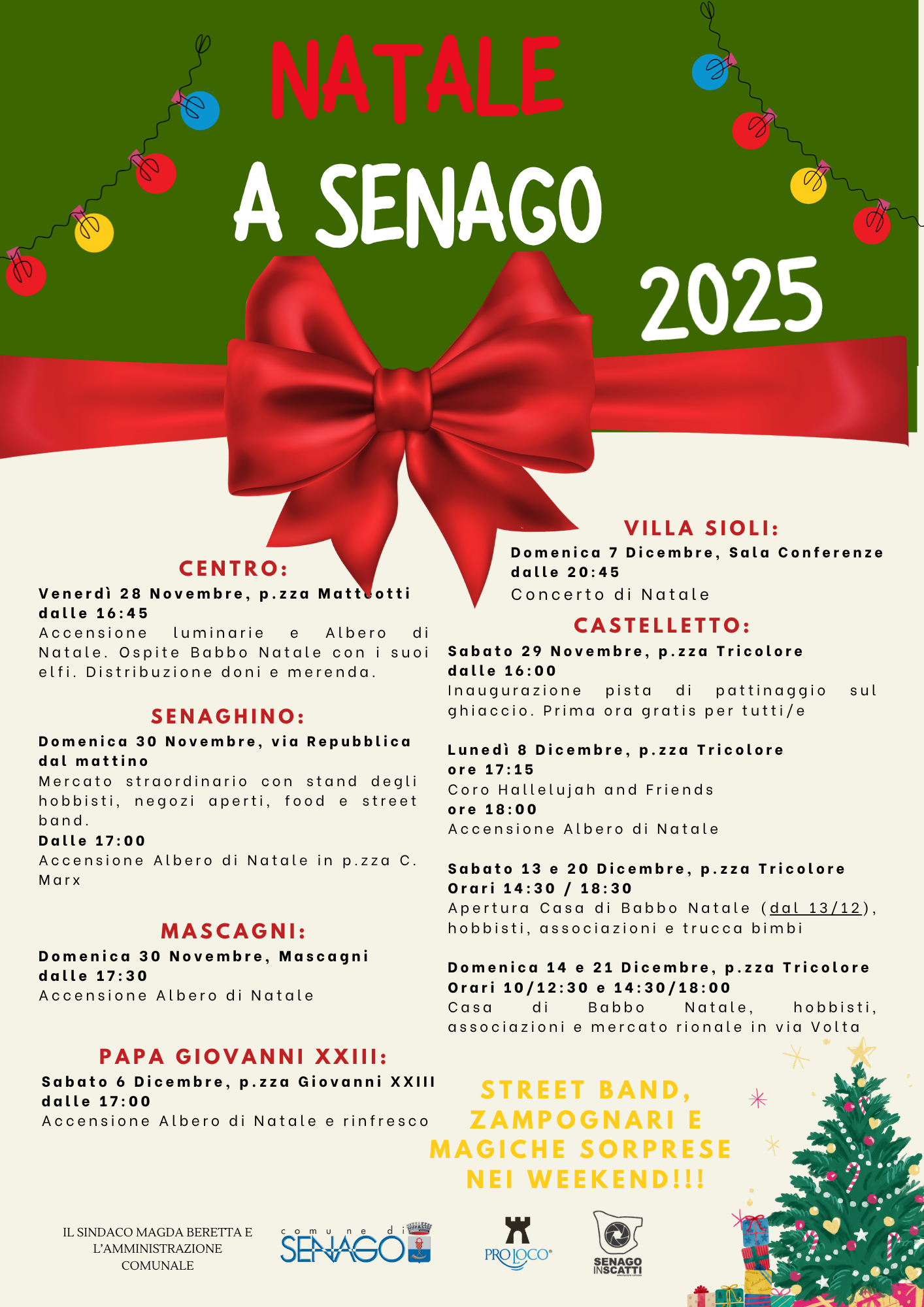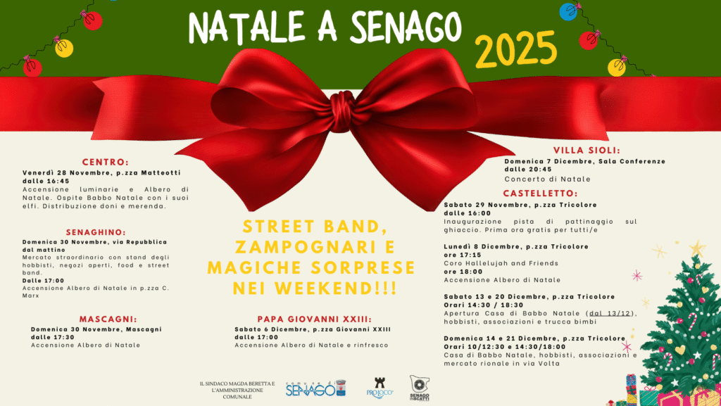 Il Comune di Senago con la partecipazione dell’associazione Pro Loco Senago, la collaborazione di volontari e commercianti, è lieto di presentare le iniziative Natalizie in programma per il paese, per tutto il mese di dicembre.