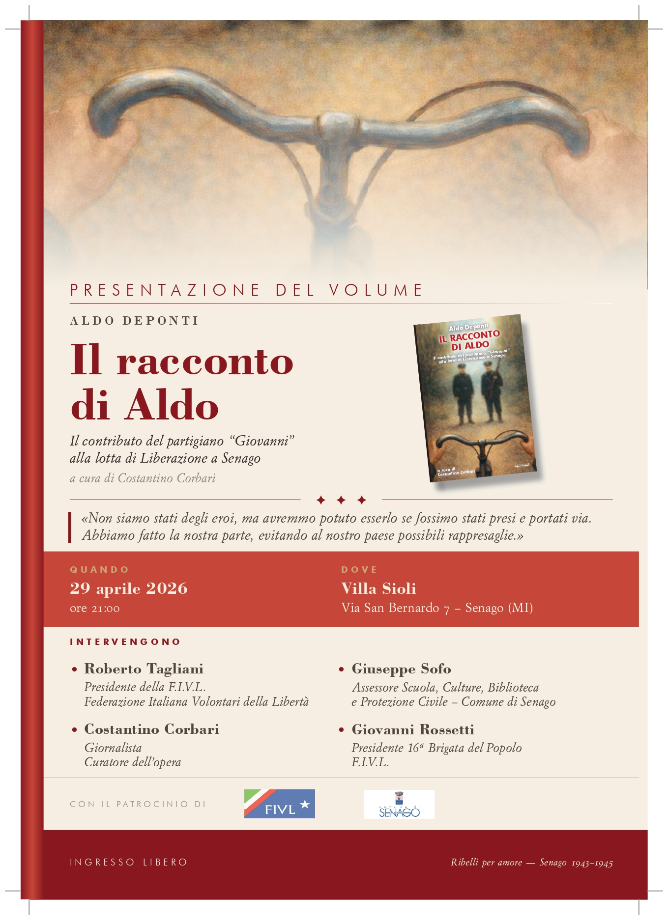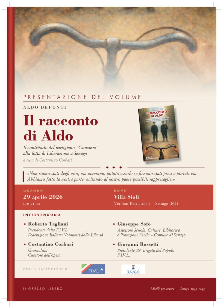 L’Amministrazione comunale invita la cittadinanza alla presentazione del volume “Il racconto di Aldo” di Aldo Deponti, a cura di Costantino Corbari, dedicato al contributo del partigiano “Giovanni” alla lotta di Liberazione a Senago.