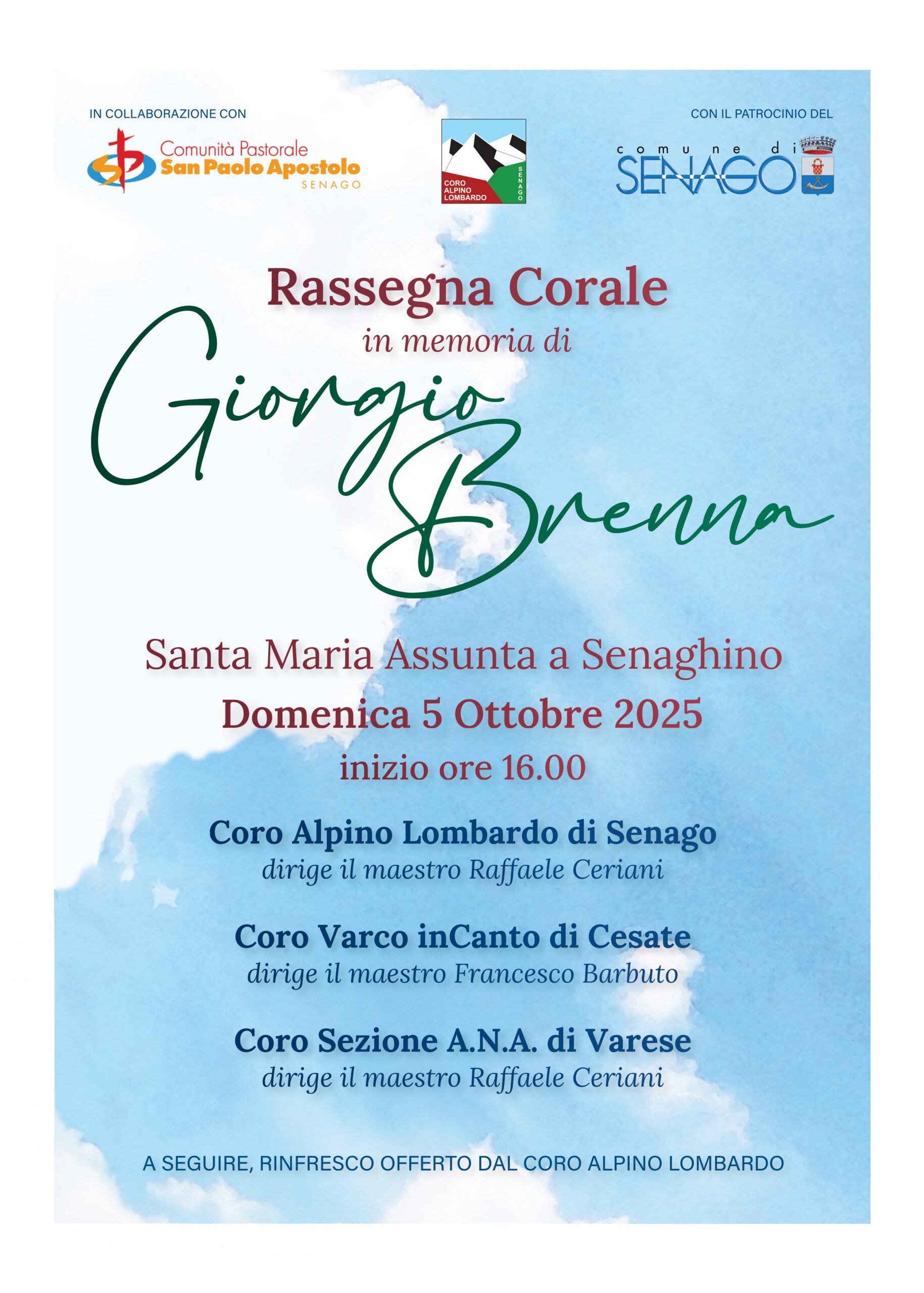 Il Coro Alpino Lombardo, in collaborazione con la Comunità Pastorale San Paolo Apostolo e il patrocinio del Comune di Senago, presenta una rassegna corale in Memoria di Giorgio Brenna.