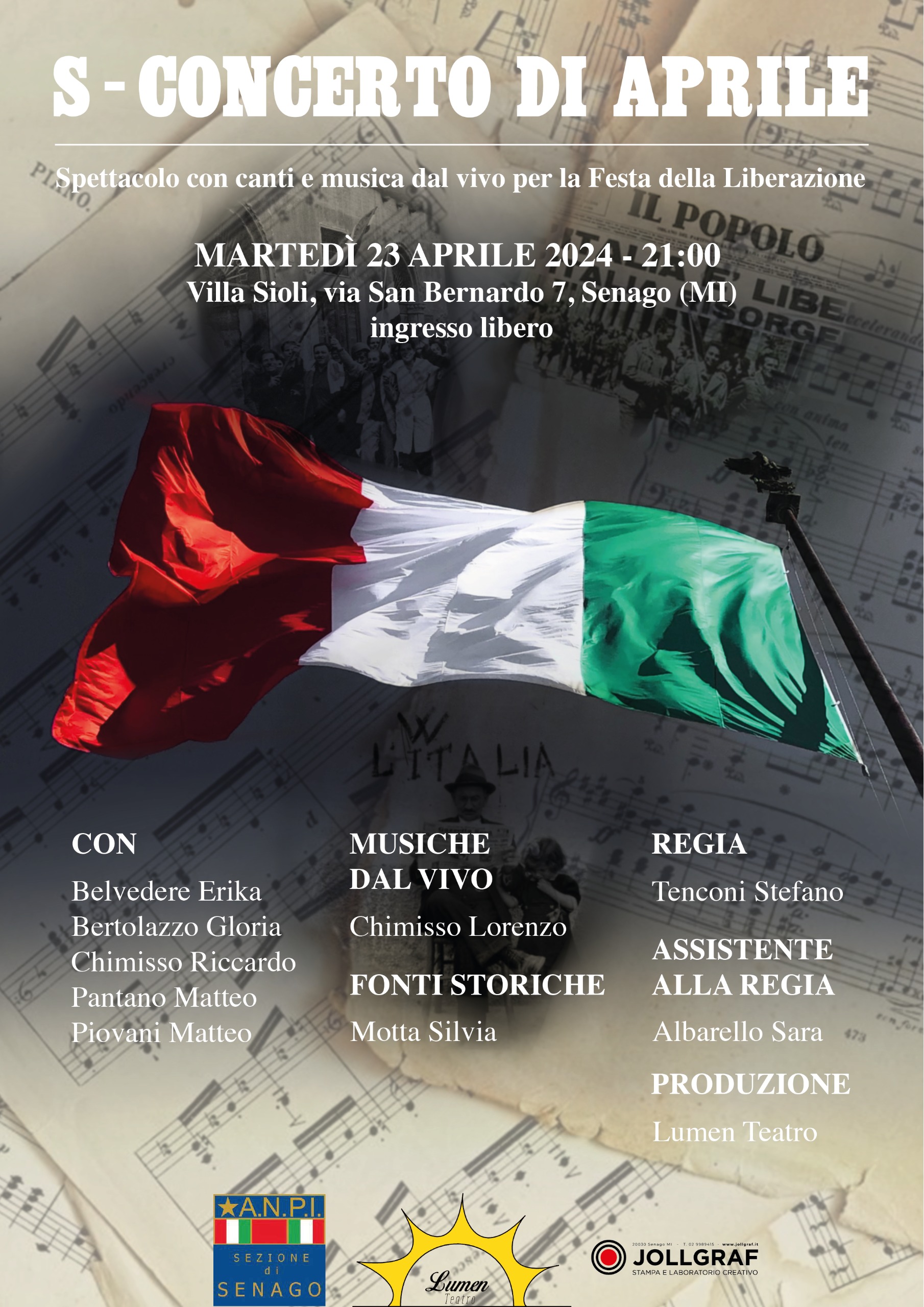 S – Concerto di Aprile, spettacolo con canti e musica dal vivo per la Festa della Liberazione, organizzato da ANPI e Teatro Lumen, con il patrocinio del Comune di Senago, si terrà presso Villa Sioli, via S. Bernardo 7, Senago, MARTEDI’ 23 APRILE 2024, alle ore 21:00