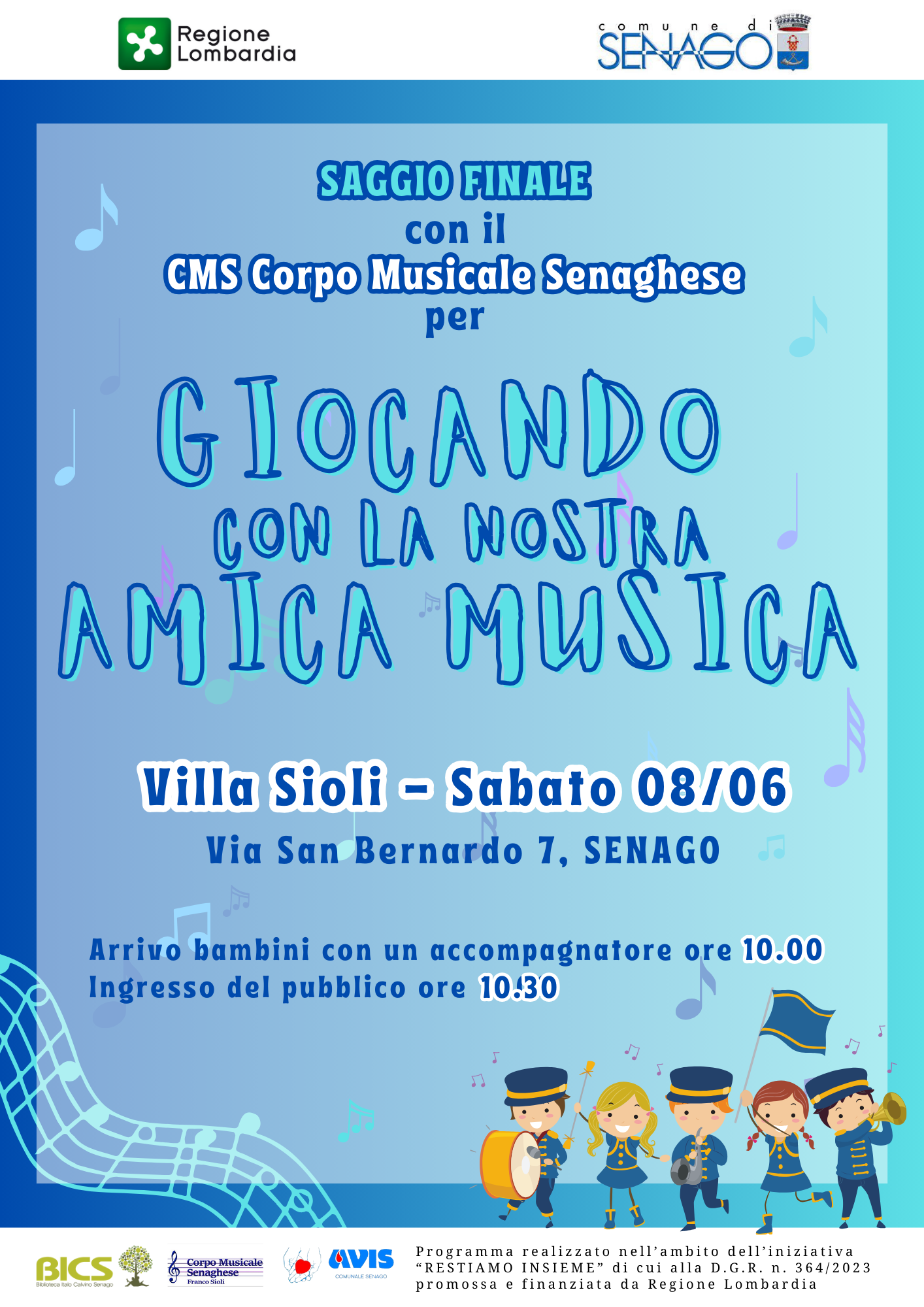 Si avvisa la Cittadinanza che sabato 8 giugno 2024 in Villa Sioli, in via S. Bernardo 7 Senago, si terrà il saggio finale del laboratorio musicale “Giocando con la nostra amica musica”, organizzato dalla BICS (Biblioteca Italo Calvino Senago) in collaborazione con il Corpo Musicale Senaghese “Franco Sioli”.