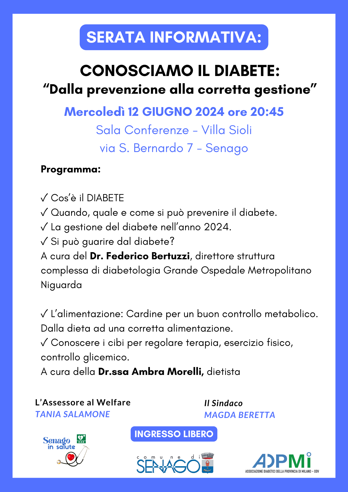 Organizzato dalla Associazione Diabetici della Provincia di Milano Odv con il patrocinio del Comune di Senago, parte dell’iniziativa Senago in Salute