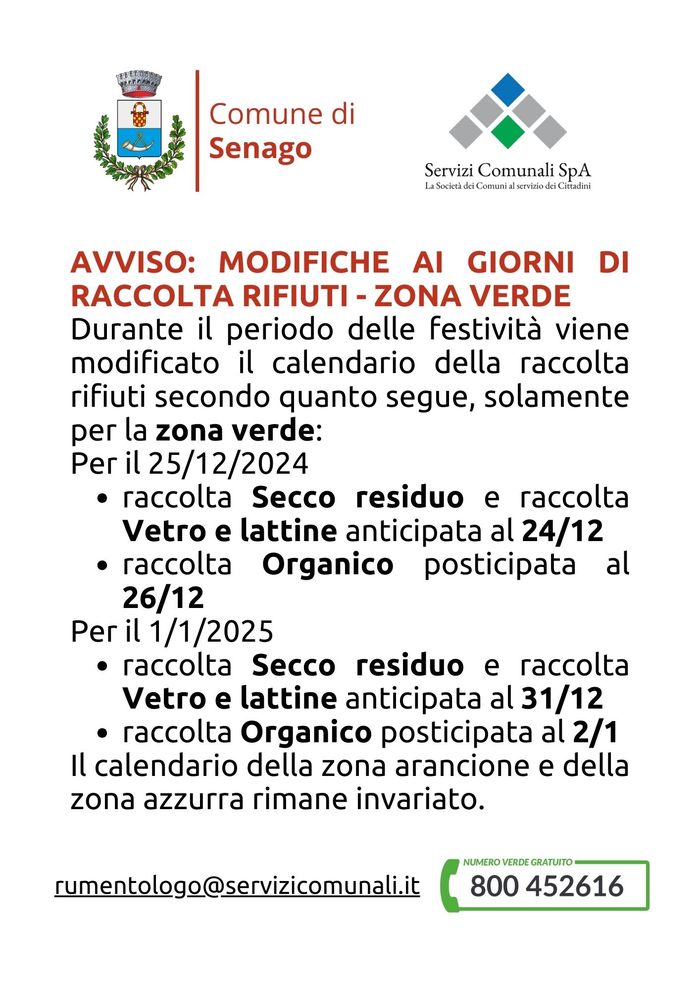 Si informa la Cittadinanza che durante il periodo delle Festività, verrà modificato il calendario della raccolta rifiuti secondo quanto segue, solamente per la Zona Verde:
