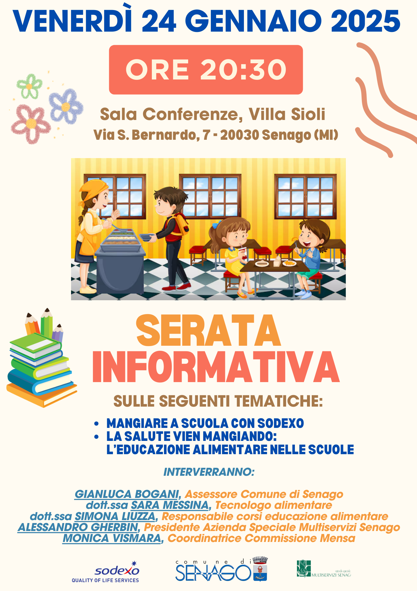 Sodexo, Azienda Speciale Multiservizi Senago e Comune di Senago presentano, per venerdì 24 gennaio 2025 ore 20:30 presso la Sala Conferenze di Villa Sioli, in via S. Bernardo 7 – 20030 Senago (MI), una serata informativa sul servizio mensa e sulle seguenti tematiche: