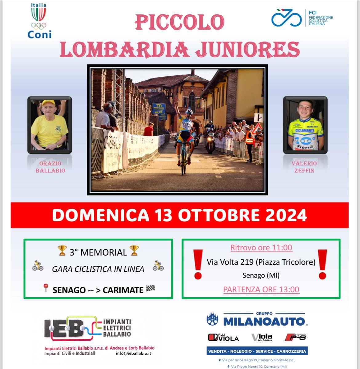 Si rende noto alla cittadinanza che domenica 13 ottobre, in Piazza Tricolore, si svolgerà il Trofeo Piccolo Lombardia Juniores 2024, gara ciclistica in linea per la categoria juniores organizzata da Asd Ciclamanti, da Senago a Carimate, in memoria di Orazio Ballabio, storico fondatore della associazione e Valerio Zeffin, atleta delle giovanili Ciclamanti deceduto prematuramente a soli 18 anni a causa di un incidente durante un allenamento.