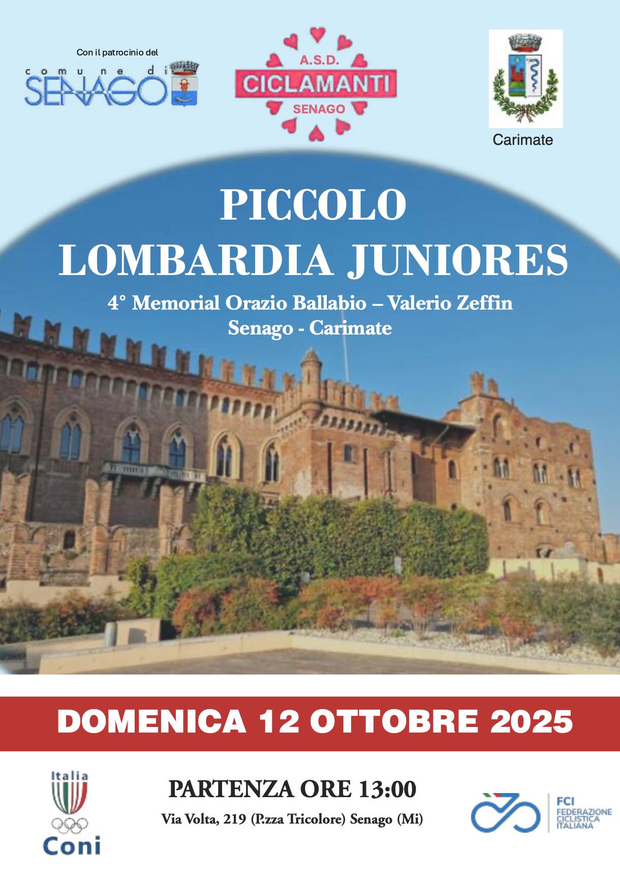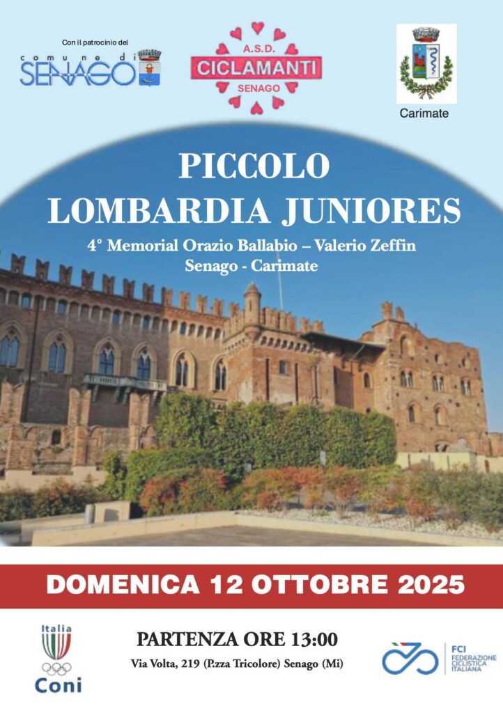 Si rende noto alla cittadinanza che domenica 12 ottobre, in Piazza Tricolore, si svolgerà il Trofeo Piccolo Lombardia Juniores 2025, gara ciclistica in linea per la categoria juniores organizzata da Asd Ciclamanti, da Senago a Carimate. Sarà il 4° Memorial Orazio Ballabio, storico fondatore della associazione e Valerio Zeffin, atleta delle giovanili Ciclamanti deceduto prematuramente a soli 18 anni a causa di un incidente durante un allenamento.