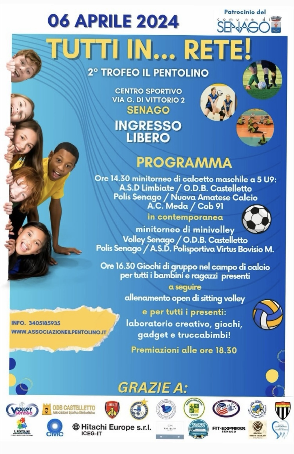 Associazione Onlus “Il Pentolino”, con il patrocinio del Comune di Senago, organizza per sabato 6 aprile 2024, presso il Centro Sportivo Comunale di Via G. Di Vittorio 2 Senago, il Secondo Trofeo “Tutti in Rete!”.