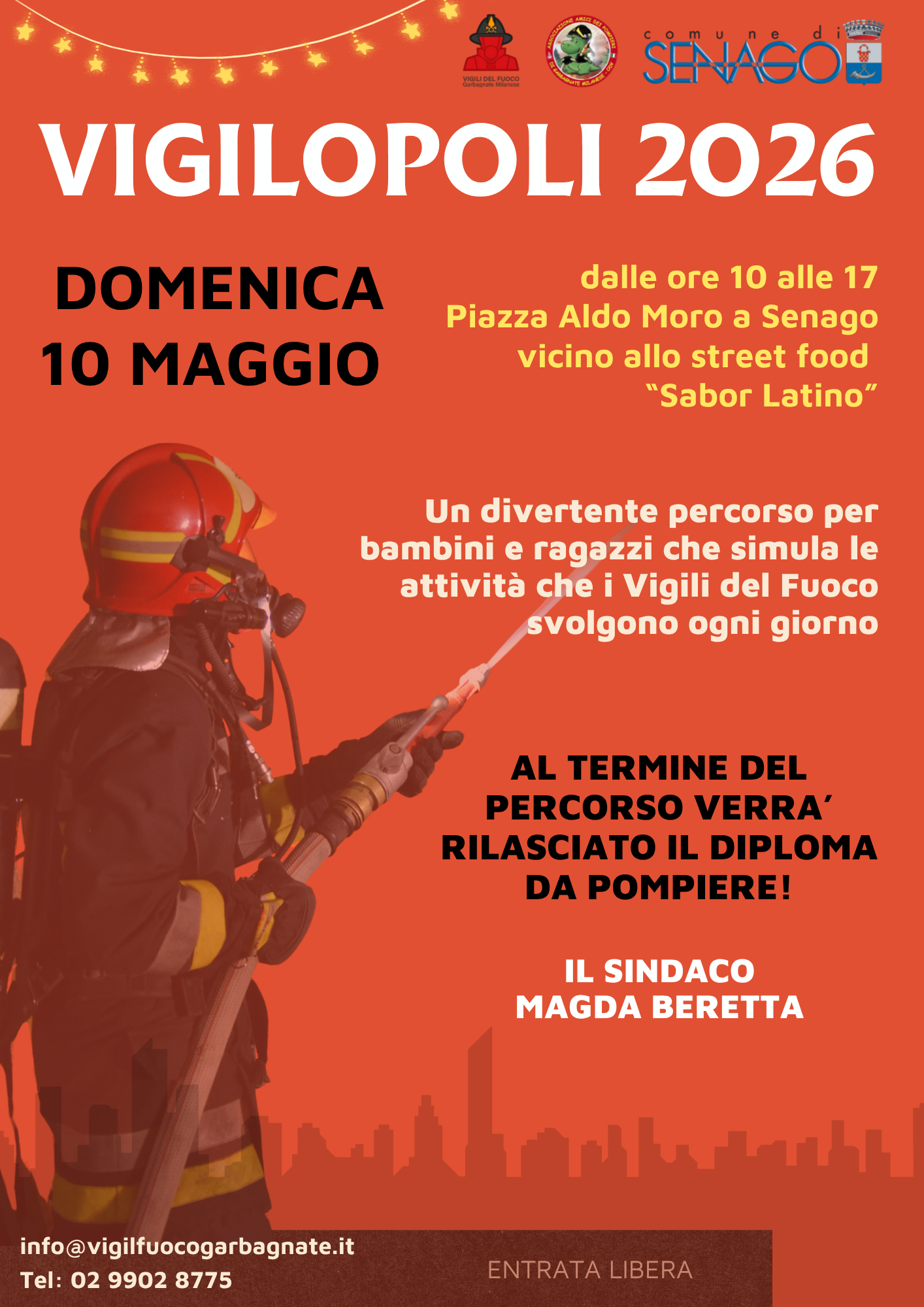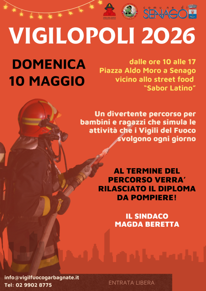 L’Amministrazione Comunale, i Vigili del Fuoco di Garbagnate Mianese, in collaborazione con l’Associazione Amici dei Pompieri, è lieta di presentare VIGILOPOLI, edizione 2026, per domenica 10 maggio 2026 dalle ore 10 alle 17, in Piazza Aldo Moro (Piazza del Mercato), affianco agli stand dello street food “Sabor Latino“.
