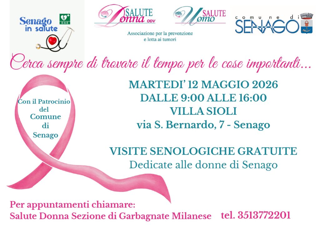 Il Comune di Senago, con il patrocinio all’iniziativa promossa dall’associazione Salute Donna ODV, informa la cittadinanza che nella giornata di martedì 12 maggio 2026, presso Villa Sioli (via S. Bernardo 7), si terrà un’importante iniziativa dedicata alla prevenzione.